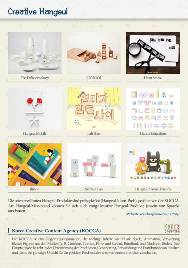 특히 이번 행사에서 소개되는 한글 디자인 상품은 문체부가 주최하고 한국콘텐츠진흥원이 주관하는 '한글 창의 아이디어 공모전'에서 수상한 작품이다. 한글에 대한 독창적 해석이 녹아든 그릇과 장난감, 봉제인형, 공예품, 엽서 등이다.